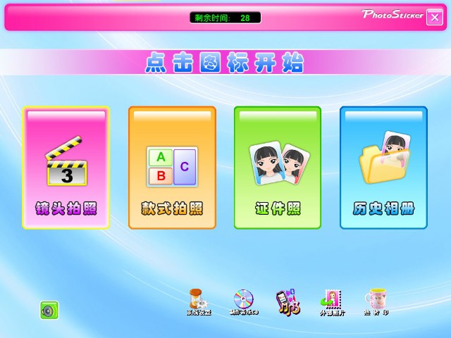 最常用的項目,點擊該大圖標(biāo)按鈕后將首先選擇鏡頭數(shù),確定鏡頭數(shù)量后進入拍照流程進行拍照、裝扮和打印等流程。
