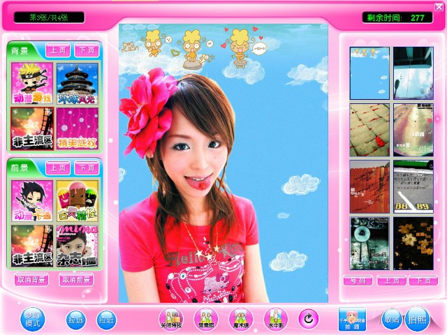 在拍照時,可在主界面左側(cè)的背景和前景類別框選擇圖片類別,此時主界面右邊會出現(xiàn)所選類別圖片的縮略圖,選擇喜歡的背景或前景圖片。
