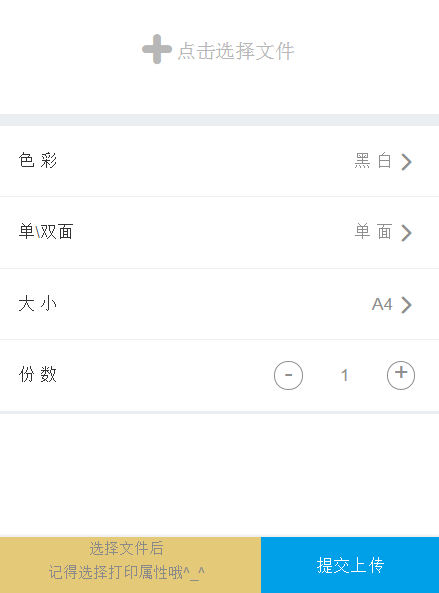 +點擊選擇文件,把手機保存的照片或者文檔,上傳,然后按照需求設置色彩、單雙面、份數。最后提交上傳