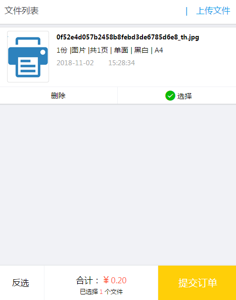 微信界面上顯示要打印的文件列表,打印的參數等,選擇后,下面又金額顯示,確認無誤后點擊提交訂單。
