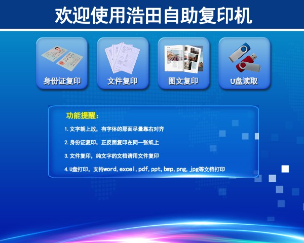界面上有【身份證復(fù)印】【文件復(fù)印】【圖文復(fù)印】【U盤讀取】可選