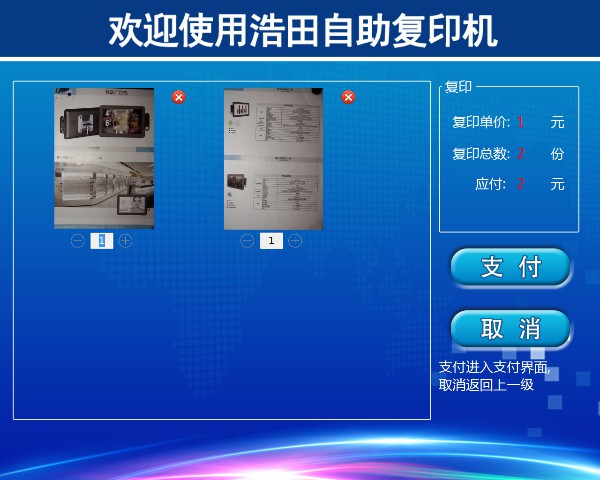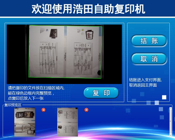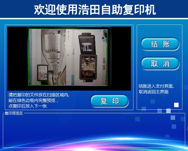 把文檔/圖片放入掃描框內(nèi),自動識別掃描進(jìn)系統(tǒng),在預(yù)覽區(qū)顯示,點擊【結(jié)賬】后后按照您復(fù)印的內(nèi)容加減份數(shù),最后點【支付】