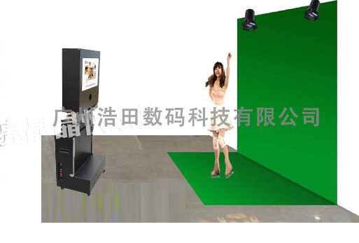 1.人站在自助拍照機(jī)前方,界面顯示背景和人像,做好合適的POSE