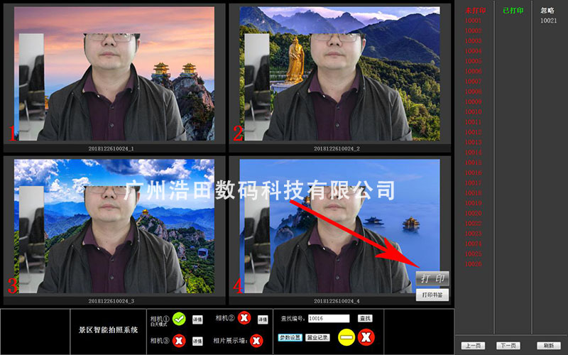 1. 人拍照完成后,電腦后臺(tái)可出現(xiàn)打印編號(hào)和{4張圖片}任選打印,打印方式直接將鼠標(biāo)移至該圖片右下角會(huì)顯示【打印】按鈕