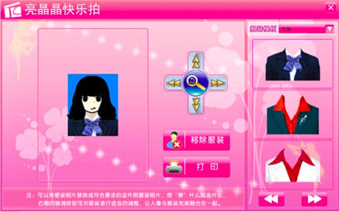 拍照完成后按“保存”鍵,會自動進入換裝界面,通過遙控器上的“放大/縮小”“左旋/右旋”鍵調節衣服的大小以及方向。若要打印,可直接點擊打印,若要退出重照,則點擊右上角的“”可退出換裝界面。