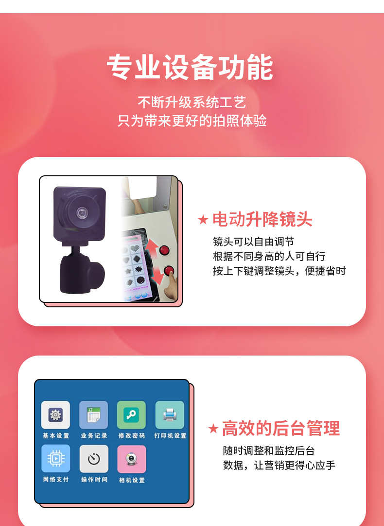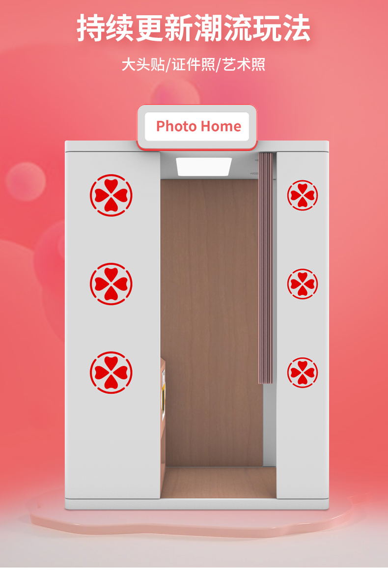 產品特點:這款大頭貼自拍機可電動升降鏡頭,滿足不同身高需求的人可直接按鍵上下移動鏡頭,非常的便捷智能化,并且軟件上更是加了AI寫真的功能,有趣好玩的拍照屋投放地點建議在年輕人密集的商場、電玩城、網紅店鋪等有消費力的場地建議投放一臺至兩臺機器以上。